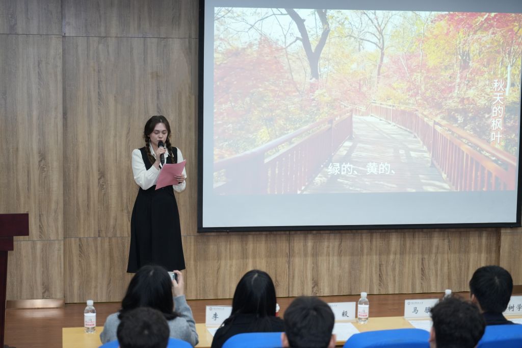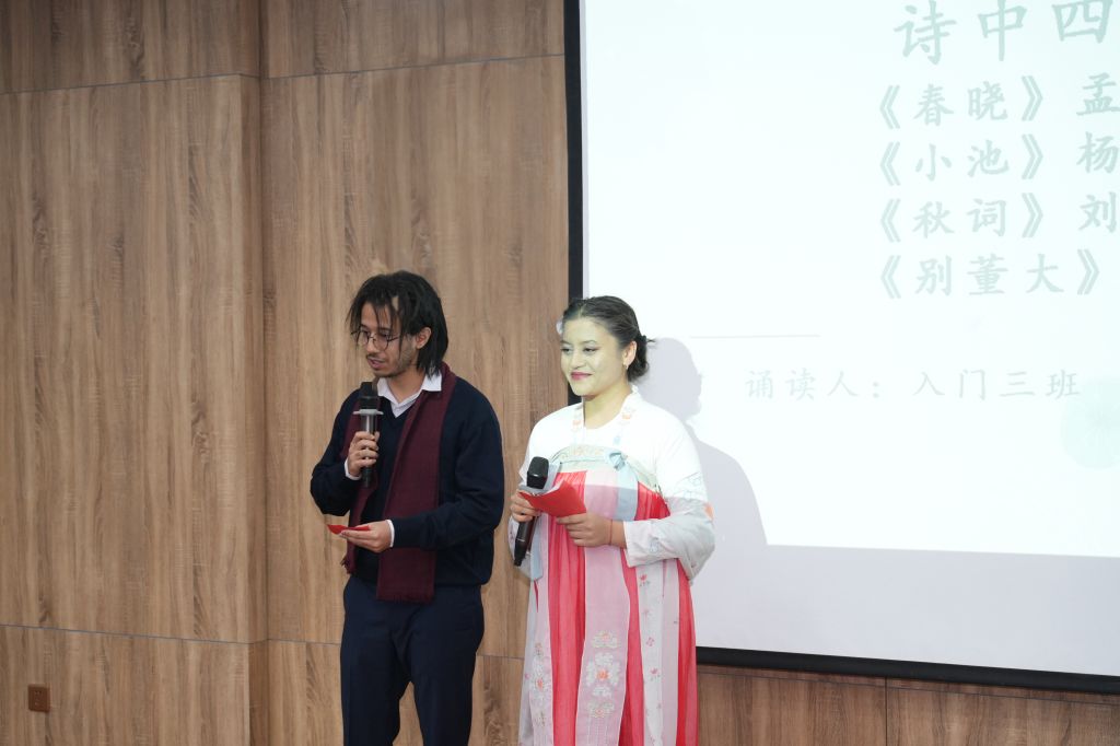 本次比赛自启动以来,经过初赛选拔,最终共有23组选手脱颖而出,晋级决赛。他们怀着对汉语的热爱与中国文化的向往,依次登台展示。决赛伊始,2024年比赛特等奖获得者李诗然同学以一首《致橡树》诗朗诵开场,其情感饱满、表达流畅的演绎,深深打动了在场师生,赢得阵阵掌声。